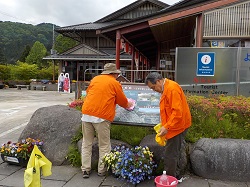 今年も旧日光市街の石屋町街区公園から東町トイレ(神橋)までの両側の歩道に設置されている、公共施設案内板の清掃活動を実施しました。