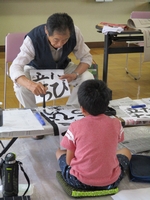書道の道具、宿題の手本と用紙、座布団、飲み物